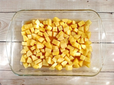 В форму для запекания или в порционные горшочки отправьте первым слоем картофель. Слегка посолите.