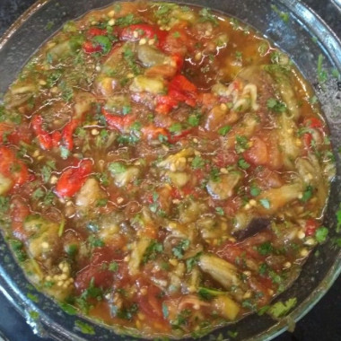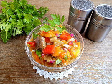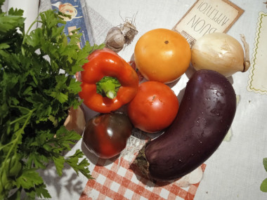 Обожаю баклажаны, понравился мне этот салат. Решила сделать армянский салат из печеных овощей. Всё предельно просто. Овощи я запекла в духовке. Выбрала жёлтые помидоры и красные перцы для красоты. Сначала положила в духовку баклажаны на 25 минут, потом к ним подложила помидоров и перцы ещё на 20 минут. Остудила, почистила от шкурки и порезала. Единственное, что я забыла запечь лук, поэтому порезала фиолетовый лук в свежем виде. Сделала заправку по описанию в рецепте. Добавила измельчённую петрушку. Чеснока положила побольше, мы любим остренькое с чесночком. Настаивался мой салатик часик в холодильнике.
