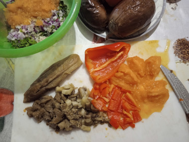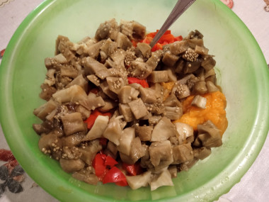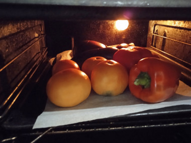Первой выньте из духовки форму с готовыми перцами и помидорами, придерживая ее прихваткой. Через 30 минут проверьте готовность баклажанов и лука — воткните в них вилку, она должны войти в мякоть плавно, без препятствий. Если они готовы — извлеките форму с этими овощами из духовки, если нет — продолжайте печь. Готовые овощи немного остудите так, чтобы они были не горячими, но при этом не успели охладиться до комнатной температуры.