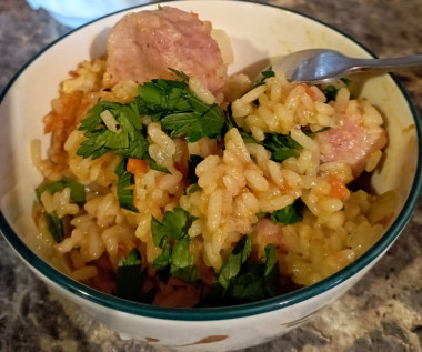 Получился вкусный рассыпчатый плов из пропаренного риса. Мясо брала замаринованное для шашлыка и готовый набор специй "для плова". Украсила домашней петрушкой ☺
