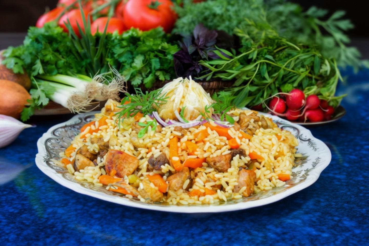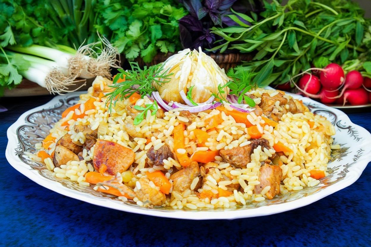 Калорийность продуктов: Лук, Свинина, Рис, Морковь, Чеснок, Куркума, Зира, Растительное масло, Барбарис, Соль