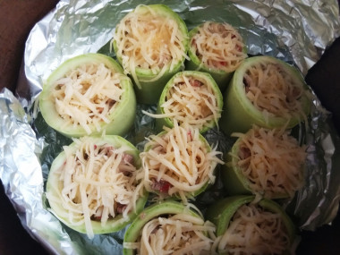 Застелите чашу мультиварки фольгой - это предотвратит прилипание и сохранит целостность кабачков. Начините кабачковые «стаканчики» мясной начинкой с горкой. Плотно установите их друг к другу в чаше мультиварки.