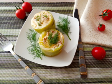 Если кабачки дают много сока, можно слегка присолить «лодочки» изнутри и оставить на 15 минут, а затем промокнуть влагу салфеткой.