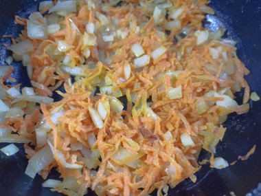 В сковороде на среднем огне разогрейте растительное масло. Вложите лук и морковь и обжарьте все вместе 5-7 минут до мягкости. В конце добавьте кориандр и карри и перемешайте. О том, как подобрать идеальную сковороду и масло для жарки, читайте в статье, ссылка в конце рецепта. В кастрюлю добавьте овощную зажарку и тушенку.Шаг 6. Сколько варить суп с овощной зажаркой?