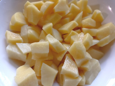 Картофель вымойте, очистите и нарежьте средними кубиками. Лук нарежьте небольшими кубиками. Морковь очистите и натрите на крупной терке. Тушенку выньте из банки и разомните вилкой на небольшие кусочки. Чтобы суп получился менее калорийным, я брала говяжью тушенку, жир в суп не добавляла. Укроп вымойте, обсушите и мелко порубите. Укроп можете дополнить или заменить другой зеленью, например, петрушкой, кинзой и т.д.Шаг 4. Сколько варить картофель с горохом?
