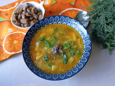 Гороховый суп с тушенкой разлейте по тарелкам, добавьте в каждую измельченную зелень и подайте к столу. Приятного аппетита!
