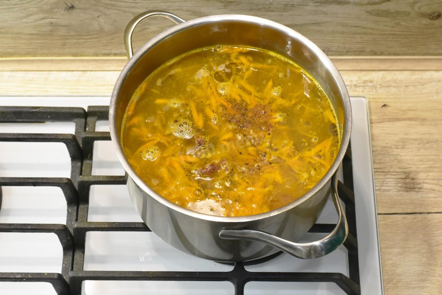 Суп посолите, поперчите и варите на небольшом огне еще 2-3 минуты. Уберите кастрюлю с огня, накройте крышкой и дайте супу настояться 10-15 минут.