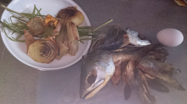 Подготовьте все необходимые ингредиенты для приготовления прозрачного рыбного бульона. Лучше всего для него подойдет кости и головы речной рыбы. Я готовила из костей и головы речной щуки. Отличный бульон получается из речной мелочи. Так как у нее очень много мелких костей, ее варят целиком. Ее не чистят от чешуи, а лишь удалите жабры, внутренности и глаза. Хорошенько промойте и завяжите в чистую марлю, в которой и будите ее и варить, а затем удаляют.