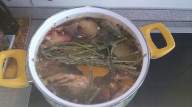 Добавьте в кастрюлю с бульоном остальные продукты. Чем больше добавлено специй и зелени, тем сильнее вкус и ярче цвет. Но не перестарайтесь, иначе забьете рыбу.
