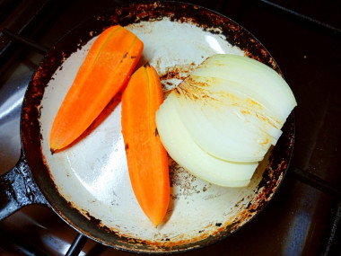 Морковь и лук почистите и обжарьте на разогретой, сухой сковородке. Это придаст бульону золотистый цвет и усилит вкус.