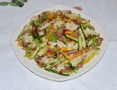 Теплый тайский салат с говядиной и болгарским перцем готовила с обжаренным кунжутом, не было арахиса. В целом, блюдо довольно сытное и аппетитное, запоминающееся своим приятным и оригинальным вкусом. Большое спасибо!