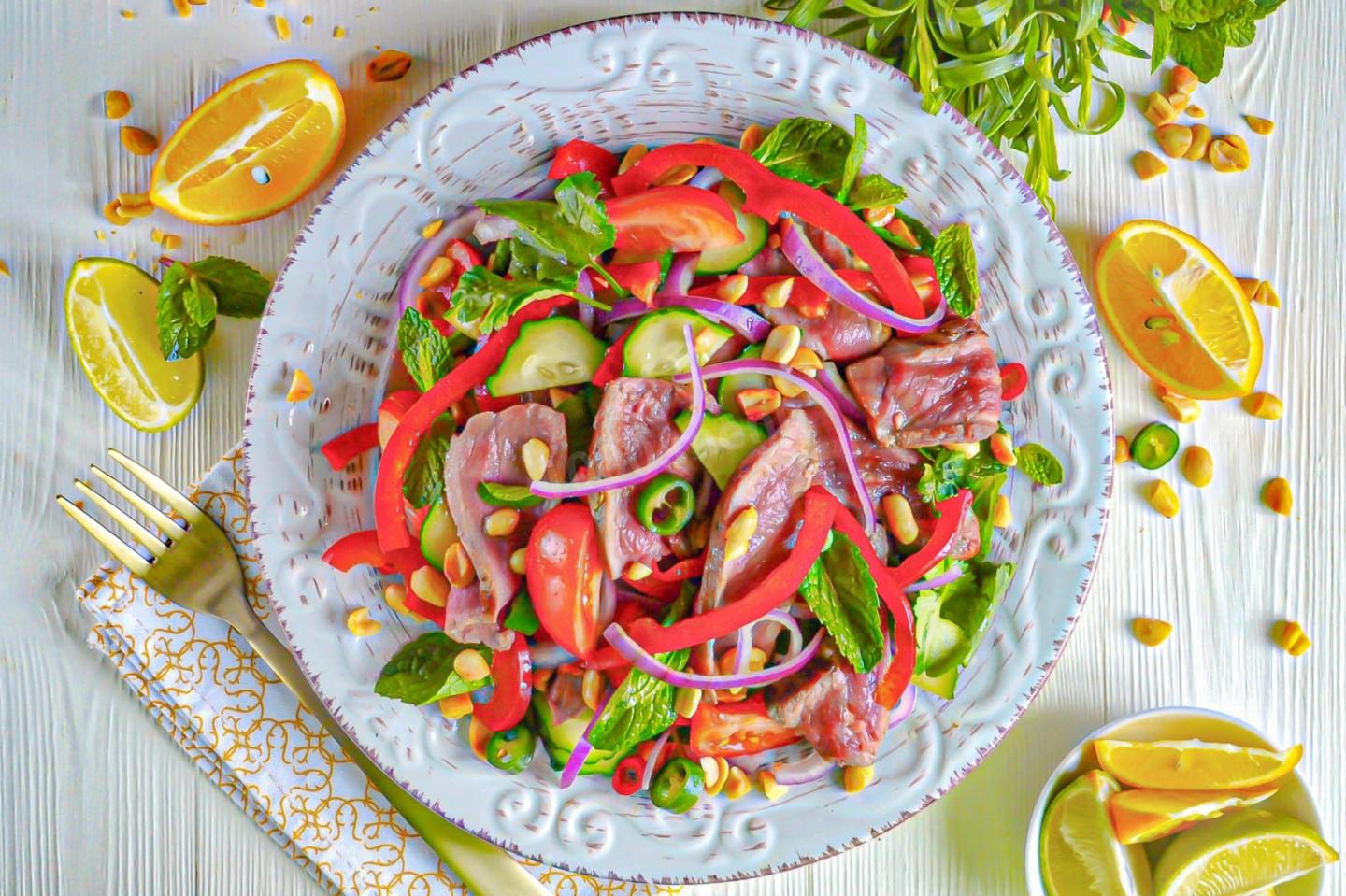 Этот теплый тайский салат — идеальный баланс белков и клетчатки. Нежная говядина восполняет потребность в железе и белке, а свежие овощи (болгарский перец, огурец, помидоры) и зелень обеспечивают витаминами. Заправка на основе сока лайма и кунжутного масла стимулирует метаболизм и содержит полезные жиры.
