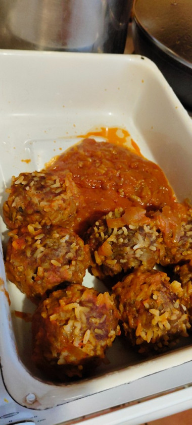 Фарш я взяла готовый - смесь свинины и говядины. Рис добавила обработанный паром, потому что в готовке использую только его. Шарики отлично слепились, во время приготовления не развалились. Вместо томатный пасты использовала кетчуп. Подала с пюре.