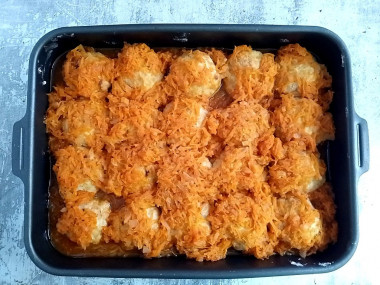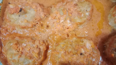 Поставьте форму в заранее разогретую до 180 градусов духовку и запекайте котлеты около 20 минут. Котлеты должны уплотниться и стать упругими. Это нужно, чтобы после добавления подливки они не развалились.