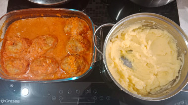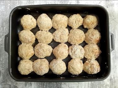 Котлеты лепила мокрыми руками и обваливала в муке. Запекала их сначала 20 минут при 200°С в режиме конвекции. На котлетах схватилась корочка, что сохранило форму. Затем запекала с подливкой еще 30 минут.