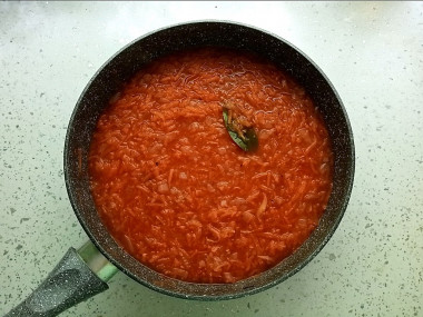Для подливки обжарила лук, морковь и зубчик чеснока. Затем потушила, добавив 500 мл. воды, томат и лавровый листочек.