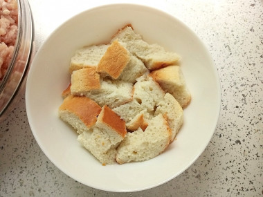 Возьмите булку, разломайте на кусочки, положите в миску и залейте холодной водой, оставьте так на 10 минут. Заливать нужно именно холодной водой, чтобы булка стала мягкой, но оставила свою структуру. От горячей воды она заваривается и превращается в кашу. Вместо булки можно взять белый хлеб, но обрежьте тогда все жесткие корки.