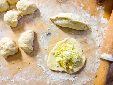 С начинкой я немного сымпровизировала. Я хотела сделать пирожки с предложенной начинкой, а дочка очень хотела капустные. Так что для начинки я мелко нашинковала молодую капусту и перемешала её с вареными яйцами. Компромисс получился, так сказать