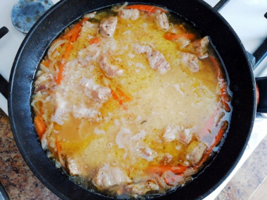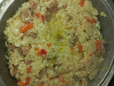 Оставьте плов томиться под крышкой еще на 10-15 минут. Затем выключите огонь и дайте плову настояться под крышкой около 10 минут. Если на дне еще останется жидкость, она постепенно впитается в рис.