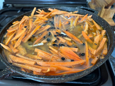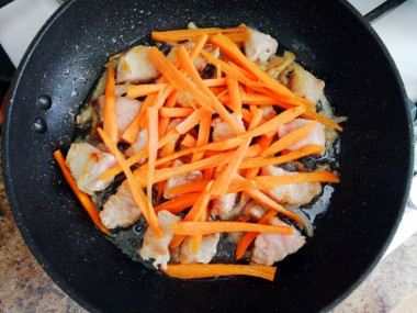 Добавьте морковь. Все посолите, поперчите и жарьте, помешивая, еще 10 минут.