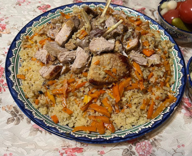 Думаю,каждый из нас хоть раз вкушал ароматные блюда среднеазиатских стран. Не исключением является всем известное кушанье "Плов", который и был приготовлен мной сегодня. Плов получился очень пряным за счёт добавления различных приправ и специй. Особую пикатность придали мною любимые кориандр и зира. В приготовлении я использовала рис "Басмати", который получился в меру рассыпчатым, а мясо выдалось очень мягким и нежным. Плов это одно из блюд,которое обязательно понравится любителям восточной кухни, оставив приятные впечатления!