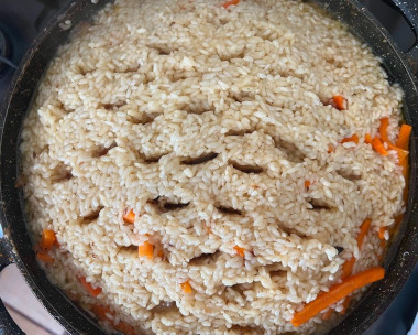 Через указанное время аккуратно соберите рис горкой в центре. При этом слой мяса старайтесь не затрагивать. Сделайте шпажками отверстия в рисе, доходя до самого дна казана. Это нужно для испарения лишней воды.
