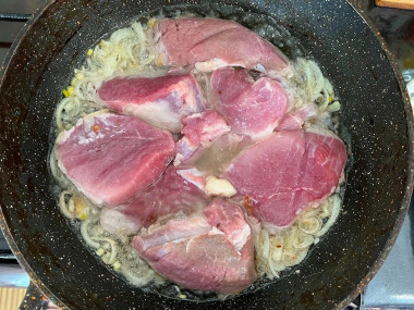 Выложите мясо и жарьте, помешивая, до появления золотистой корочки около 20 минут. За это время лук сильно размягчится.