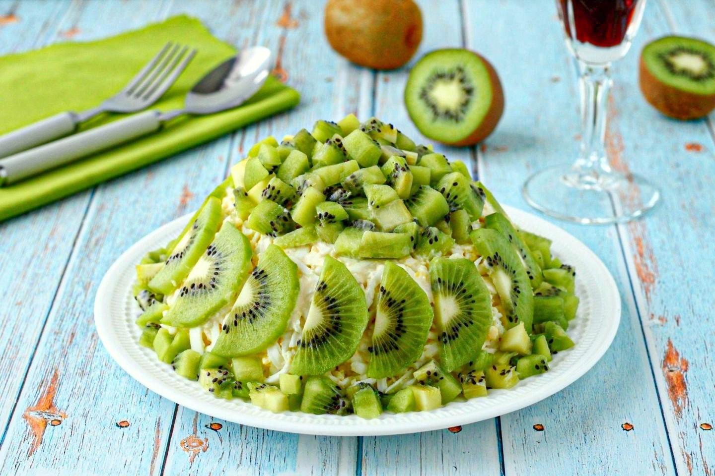 Перед подачей украсьте салат киви. Фрукты помойте, очистите от кожицы. Часть киви нарежьте мелкими кубиками, разместите внизу по окружности и на верхушке салата. Остальные нарежьте полукольцами и выложите по бокам. Можно украсить салат киви по своему желанию. Например, если украсите только верх салата, у вас получится Изумрудная поляна.