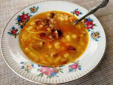 Суп просто "зачётный"! Находка для зимнего меню. Главным открытием для меня стало предварительное обжаривание грибов. Дело в том, что раньше, варя суп, я добавляла сырые грибы. Да и все грибы, которые предназначались для заморозки, никогда не отваривала. Резала крупно, складывала в пакеты и отправляла в морозильную камеру. Грибочки, попадая в суп, становились немного ватными, водянистыми. А вот благодаря жарке они сохранили свою плотность и отличный вкус. Варила супчик на мясном бульоне, взяв для этого 200 г постной свинины. Обжаривала грибы на растительном масле с добавлением сливочного для того, чтобы придать супу нежную сливочную нотку. В конце варки добавила две горсточки мелкой яичной лапши. Суп получился густым (как мы любим), насыщенным, ароматным и очень вкусным. Большое спасибо за замечательный рецепт!