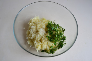 Пока тесто отдыхает, приготовьте начинку. Картофель и лук помойте и очистите. Укроп (или другую зелень) мелко порубите.