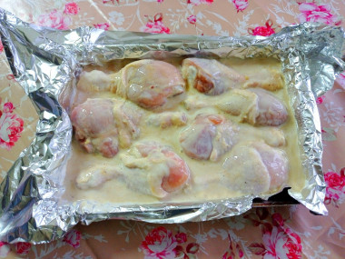 Курицу выложите в жаропрочную форму или на противень и полейте маринадом. При желании курицу можно выложить на подушку из картофеля, тогда у вас сразу будет полноценное самодостаточное блюдо. Накройте курицу фольгой или крышкой и поставьте в разогретую до 200 градусов духовку на 1-1,5 часа. Точное время зависит от самой духовки. Готовность курицу можно проверить, сделав надрез на мясе: из него должна сочиться прозрачная жидкость.