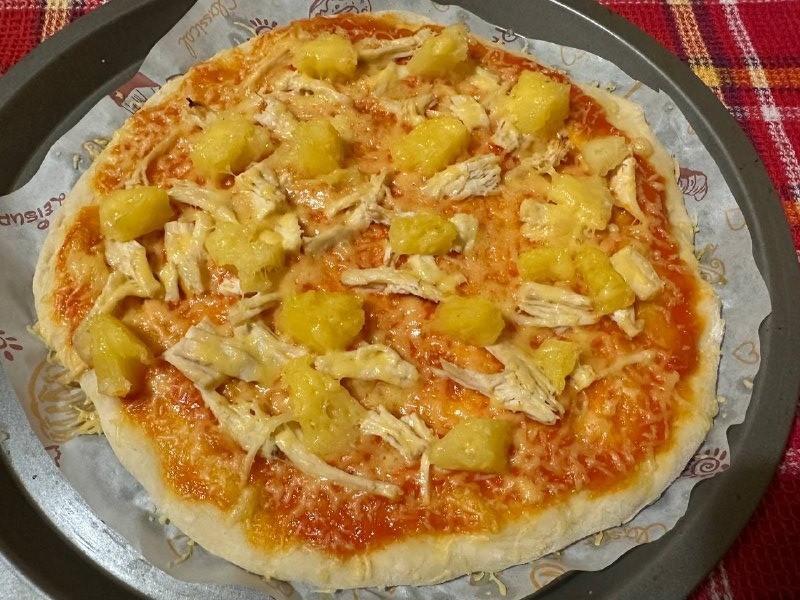 Пицца с ананасами и курицей гавайская - это одна из самых вкусных пицц! Увидела рецепт и захотелось приготовить. Ведь домашняя пицца всегда намного лучше, чем магазинная. Сделала тесто по описанию в рецепте, положила в пакет подходить и занялась начинкой. Отварила куриное филе до готовности. Сделала томатный соус из томатной пасты, разбавив водой, посолила и положила сушёный базилик. Консервированные ананасы нарезала кубиками. От себя ещё добавила репчатого лука, порезав полукольцами. Твердый сыр российский крупно потёрла. Подошедшее тесто тоненько раскатала, смазала соусом и равномерно разложила начинку из отварного куриного филе кубиками, ананасов, лука и присыпала немного приправой для курицы, чтоб ароматнее было. Сверху посыпала сыром и выпекала 12 минут при 320 С. Потрясающе ароматная, вкусная и аппетитная пицца. Кстати, название она своё получила не из-за островов, а потому что раньше называли консервированные ананасы "гавайскими" ))) Великолепный рецепт! Пицца вкусная, сочная и сытная с чуть сладковатым привкусом. Приправки придали аромата пицце. Супер мега вкусно!!! Обязательно забирайте в копилку!!! Благодарю автора 😀
