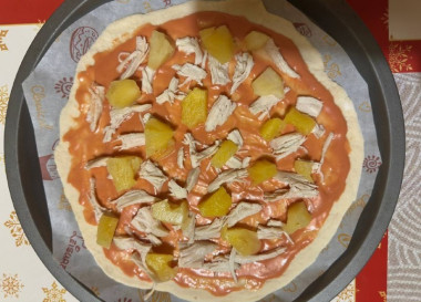 Куриной филе руками разорвите на небольшие кусочки и разложите их равномерно по пицце. Выложите на пиццу ананасы.