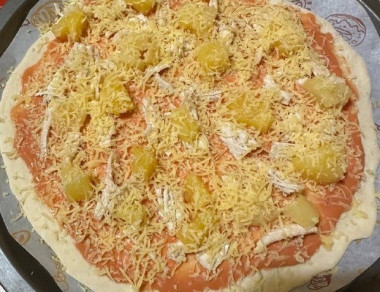 Спасибо за рецепт к пицце. Пробовала приготовить, получилось очень вкусно! А так как она "Гавайская", то думаю можно добавлять смесь замороженных овощей "Гавайская смесь" (разморозить и поджарить).Получится очень интересно