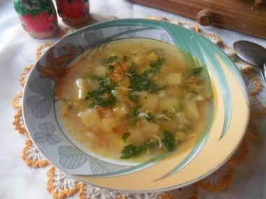 А затем лук с морковью. Снова накройте кастрюлю крышкой и варите суп 15 минут, картошка должна стать мягкой.