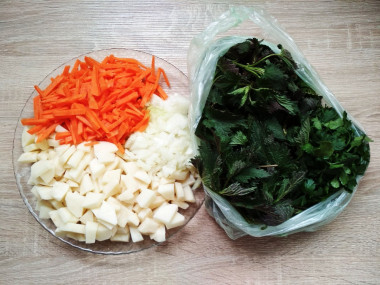 Слейте с крапивы кипяток, саму траву соберите в комок и слегка отожмите. Нарежьте крапиву довольно мелко, как режут зелень.