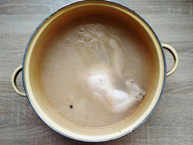 Бульон тем временем закипит, снимите с него пену шумовкой. Добавьте соль, убавьте огонь и варите бульон под закрытой крышкой 30-40 минут, в зависимости от частей курицы.