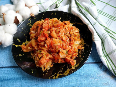 Затем добавьте в сковороду томатную пасту, перемешайте. Если вдруг не оказалось томатной пасты в наличии, ее можно заменить томатным соком или кетчупом. Потушите все вместе минут 5-7.