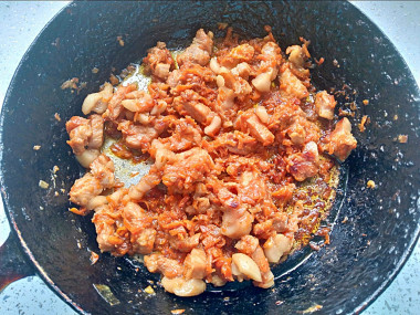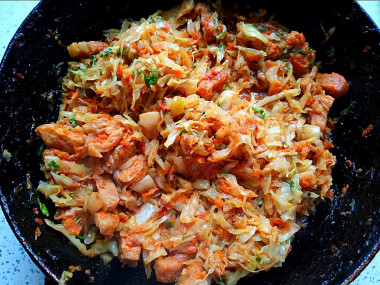 Добавьте капусту в сковороду. Интенсивно помешивая, обжаривайте все вместе еще минут 7-10.