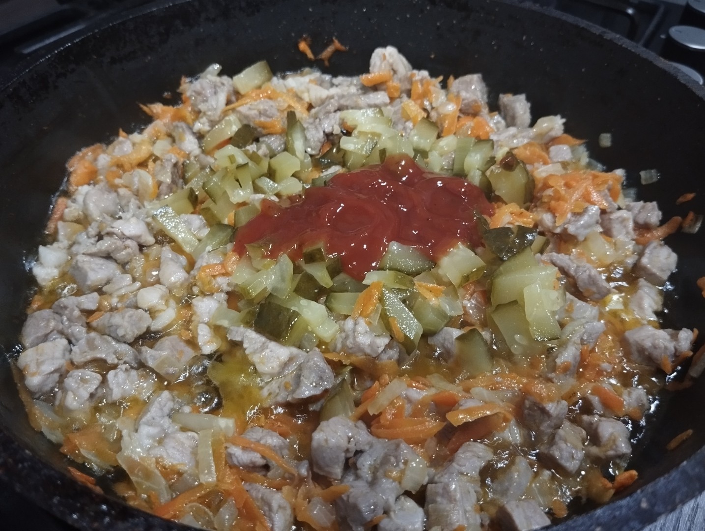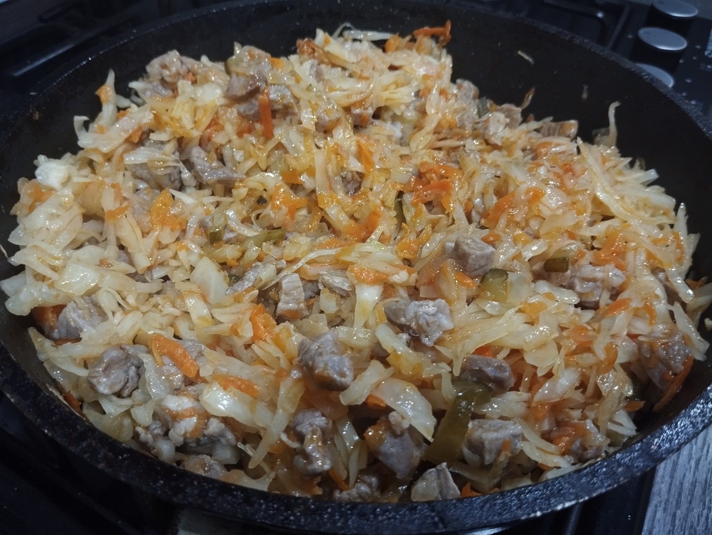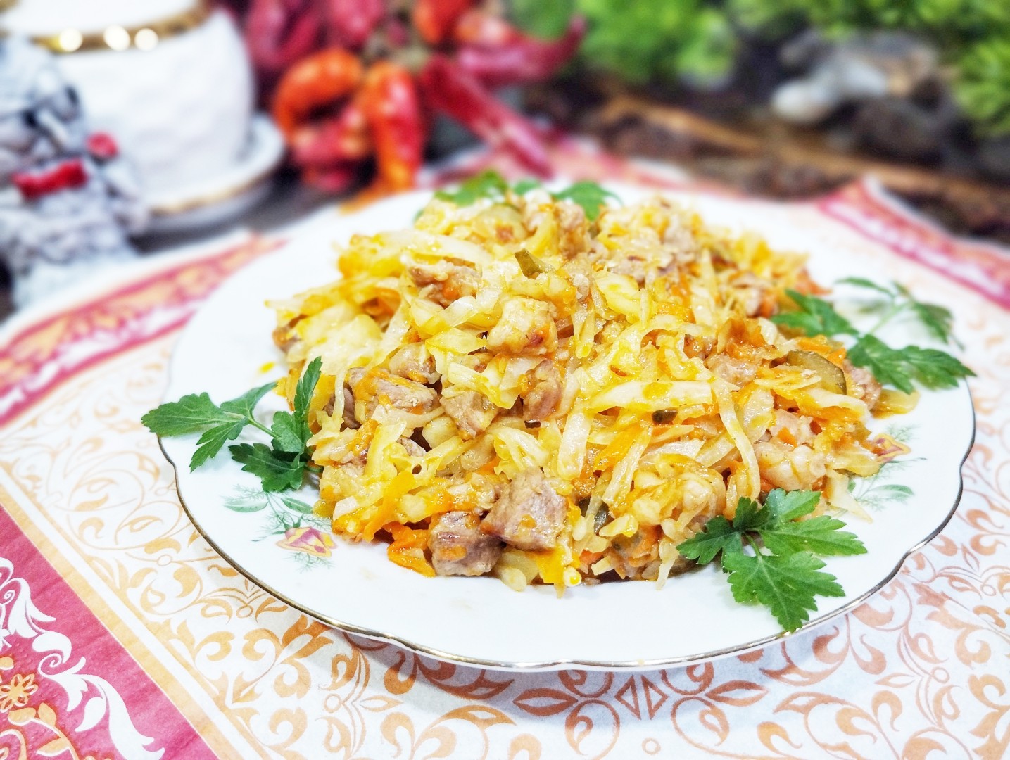 На ужин приготовила солянку из капусты с мясом свинины. Это блюдо очень вкусное! Я просто обожаю такое сочетание продуктов, муж со мной солидарен. А вот дети у нас любят просто тушеную капусту, с нами есть не стали) Зато я не стала себе отказывать в количестве чеснока и специй! Свинина у меня была с жирком, нежная и сочная. Обжаривала ее практически без добавления масла. Обычно я жарю отдельно мясо, а потом соединяю с овощами. Но по рецепту надо последовательно закладывать продукты, поэтому следовала рецепту. Соленый огурец я не стала резать кубиками, натёрла его на тёрке вместе с морковью. Мне кажется, так более однородно получается. Продуктов я взяла в 1,5 раза больше. Для этого воспользовалась удобным калькулятором. На это количество овощей и мяса взяла четыре зубчика чеснока. А ещё добавила паприку и черный перец. Получилось, ну, очень вкусно, остро, сочно и сытно! Спасибо за рецепт, нам он пришелся по душе)