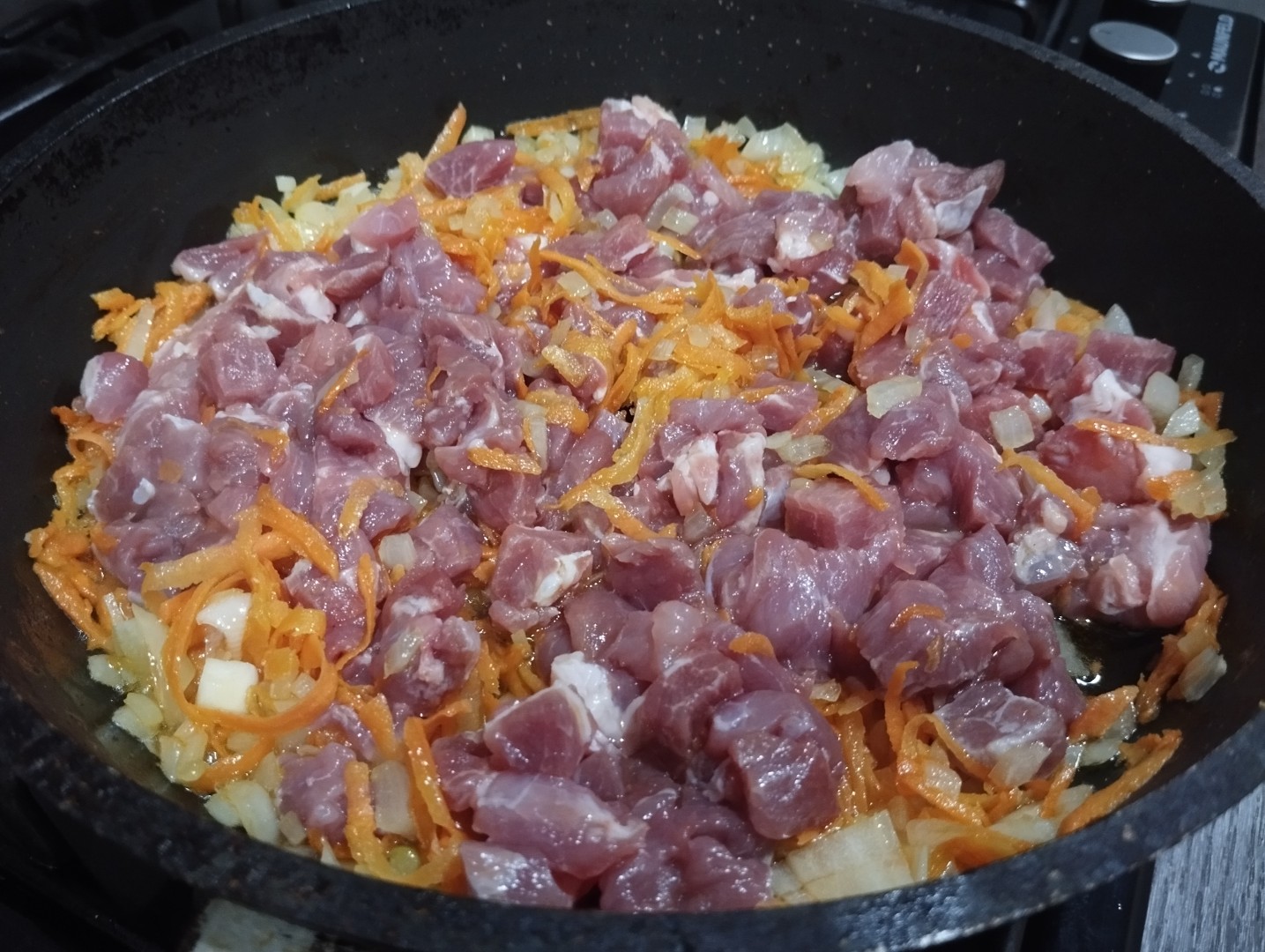 Затем выложите в сковороду мясо, перемешайте и продолжайте обжаривать. Время обжаривания около 10 минут.