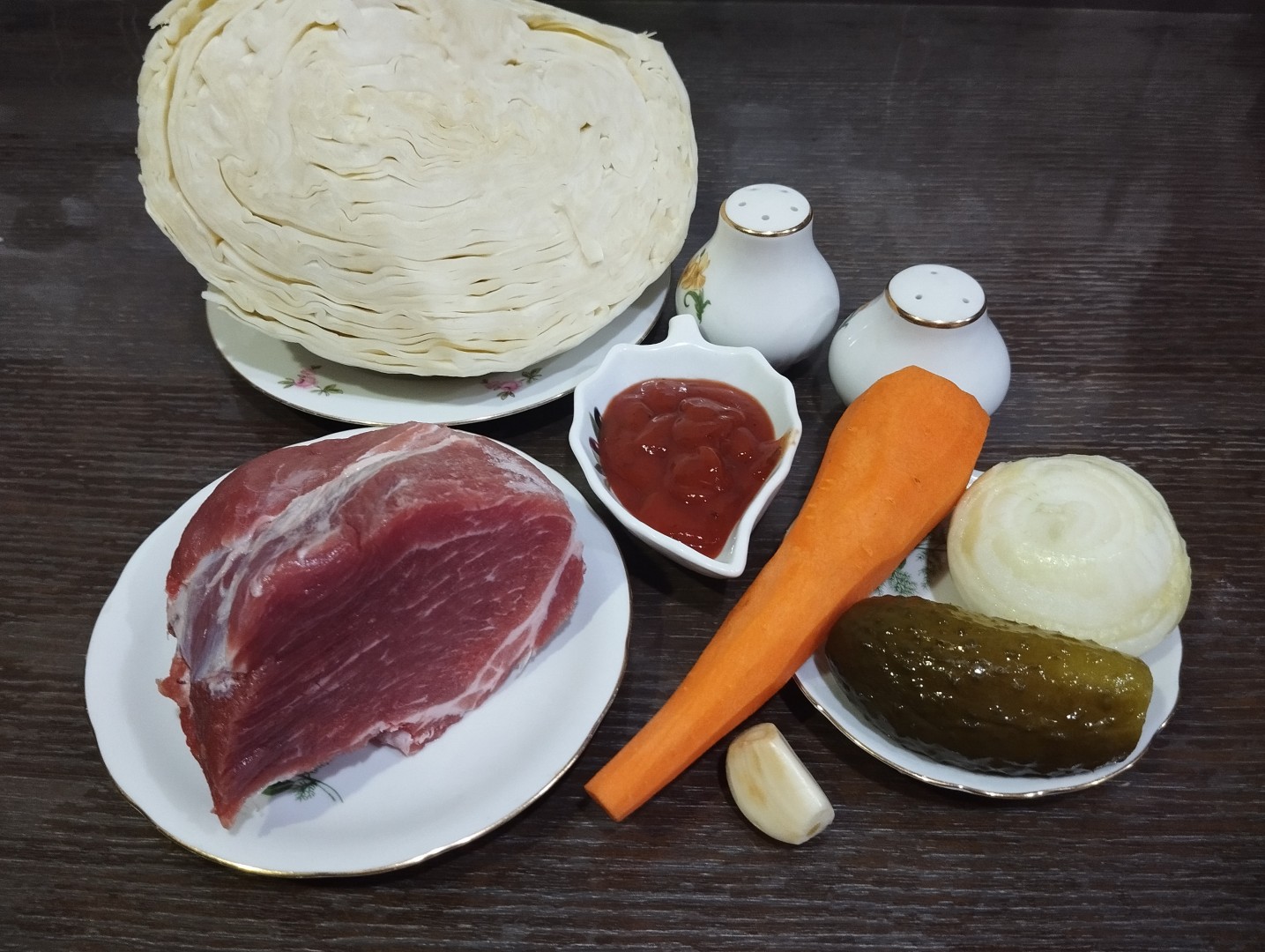 Как сделать солянку из капусты с мясом свинины? Подготовьте все необходимые продукты. Овощи берите свежие, сезонные, желательно нового урожая, особенно это относится к капусте. Огурцы обязательно берите соленые - маринованные огурцы сюда не подойдут. Вы можете взять любую часть свинины: и шею, и окорок, и грудинку. При желании можете взять мясо теленка, говядину, и даже мясо птицы. Или же вполне можете взять сосиски или колбасу - просто для фантазии!