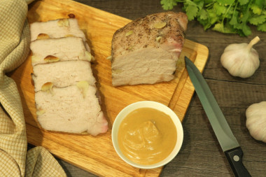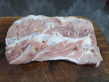 Нашпигуйте свинину чесноком. Оставьте мясо мариноваться на 1-2 часа. Если маринуете не дольше часа, то можно оставить при комнатной температуре (при условии, что в квартире не очень жарко), если дольше, то лучше поставьте в холодильник.