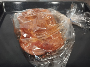 Выложите мясо в пакет для запекания и смажьте оставшимся в миске растительным маслом. Затяните пакет специальной клипсой. Вместо пакета для запекания можете использовать рукав для запекания, он сделан из того же материала, просто нужно отрезать кусок нужной длины от целого рулона и затягивать клипсами с двух сторон.