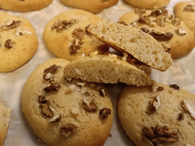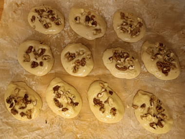 Выложила ложкой на противень в виде печенья, тесто держит форму и не растекается, сверху присыпала слегка измельченными ядрами грецких орехов, слегка их придавив.