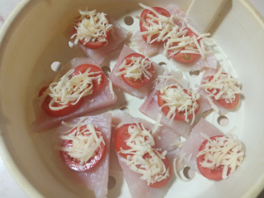Выкладываем в чашу-пароварку слой рыбки, солим-перчим по вкусу...