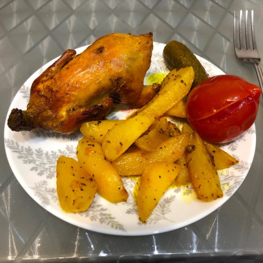В итоге перепелки подрумянились, но не сильно. Кожица осталась мягкой, не хрустящей. Мясо у перепелок более плотное, чем у магазинной курицы. Оно нежное, ароматное, очень сочное! Вкус интересный, насыщенный! Не смотря на то, что перепелки маленькие, нам на одну порцию хватило по половине тушки). Они очень сытные! А вместе с запеченными овощами получился полноценный ужин.