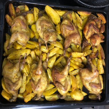 Когда перепелки промаринуются, включите духовку для разогрева на 180 градусов (примерно за 10-20 минут до начала запекания). Картошку нарежьте на четвертинки, выложите в слегка смазанную растительным маслом с высокой температурой дымления форму для запекания, посолите, поперчите по вкусу.