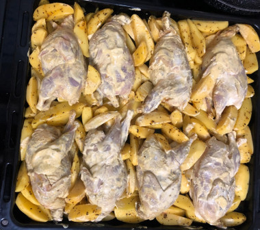Сверху на картошку выложите птичек, можно по желанию слегка смазать тушки майонезом. Поставьте форму в духовку приблизительно на час (ориентируйтесь на особенности своей духовки). В процессе можно один раз перевернуть тушки, а за 5 минут до окончания готовности (если есть в духовке) включите режим "гриль", чтобы образовалась аппетитная корочка))