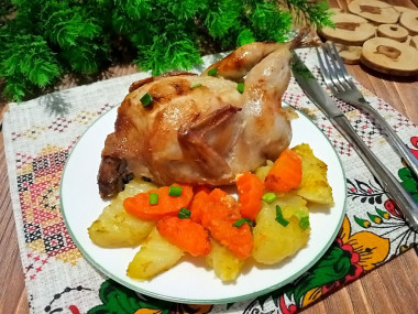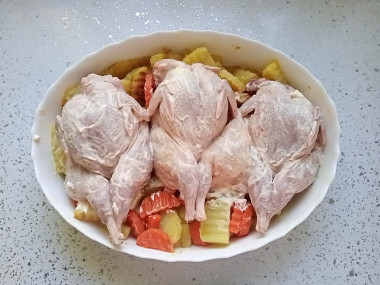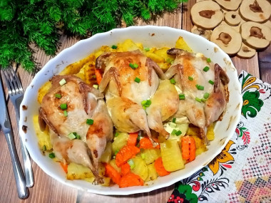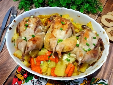 Запекала в фарфоровой форме, смазала ее маслом и выложила овощи. Сверху разложила перепелок. Тушки уже были разрезаны по хребту, поэтому вывернула их и запекала в одном положении. По совету автора смазала перепелок майонезом. Запекала 1 час при 180°С + 10 минут под грилем. Боялась пересушить, ведь птички маленькие, поэтому через 40 минут проверила на готовность. После прокола острым ножом вытекал прозрачный сок, но верх был еще бледноват. Решила запекать дальше).